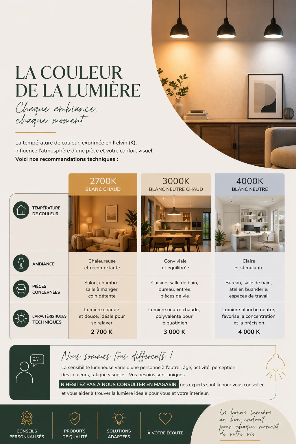 - Privilégiez des ampoules LED avec Kelvin adapté
