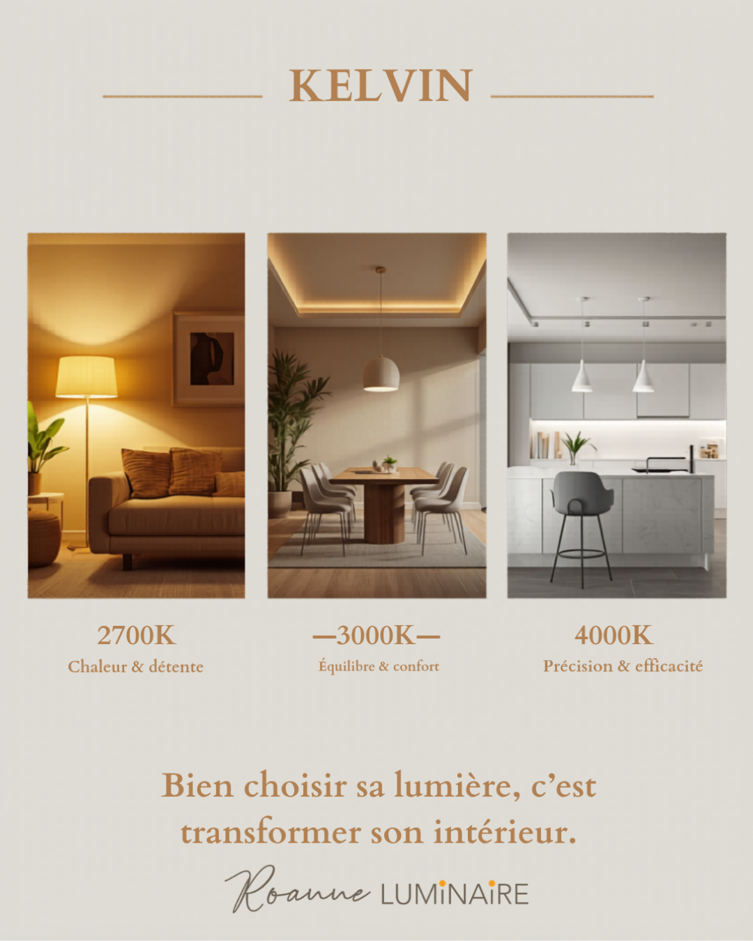 - Kelvin moyen = lumière neutre (blanc naturel)