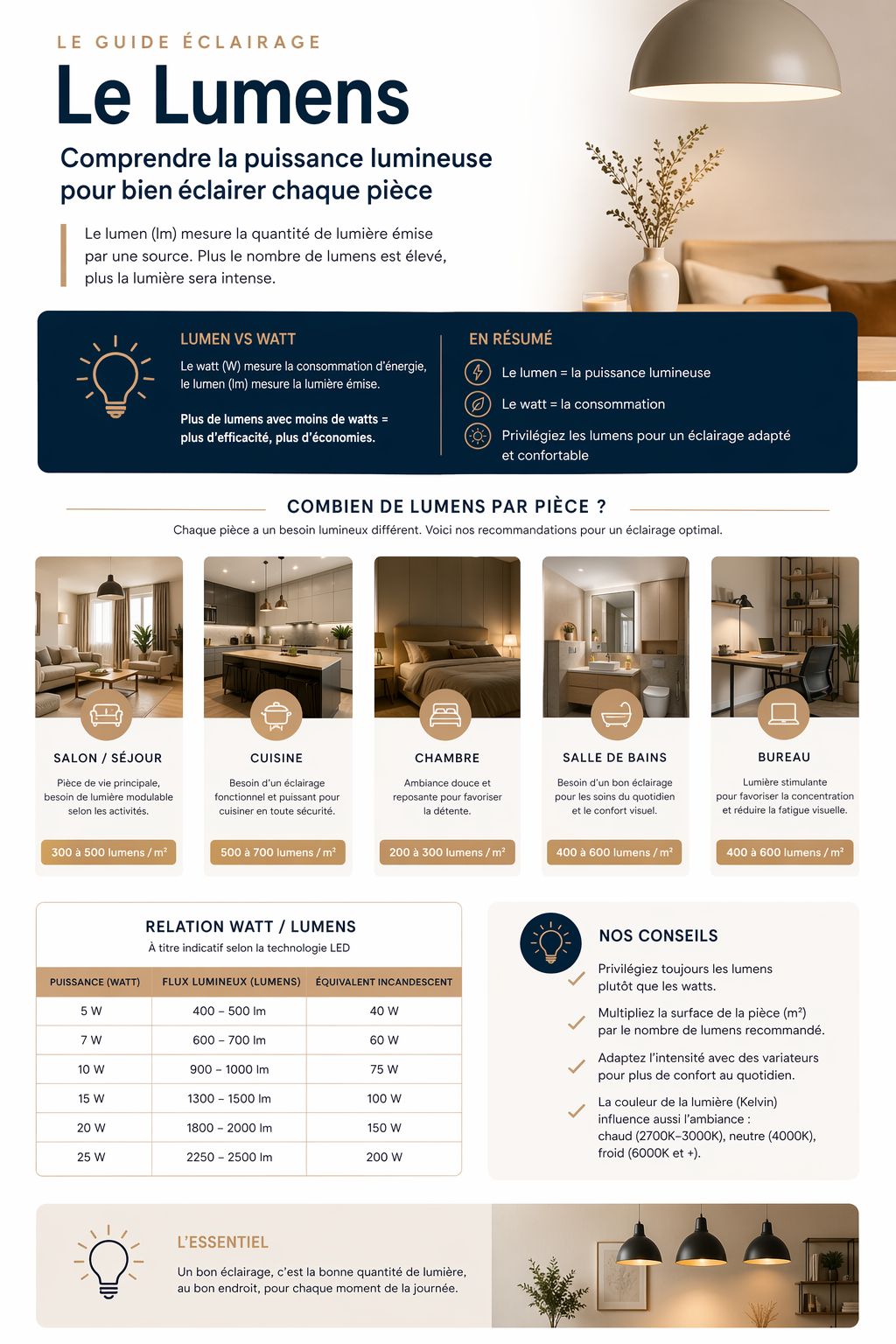 Comprendre le lumen est essentiel pour réussir son éclairage intérieur. En adaptant la puissance lumineuse à chaque pièce, vous améliorez votre confort, votre bien-être et l’esthétique de votre espace.